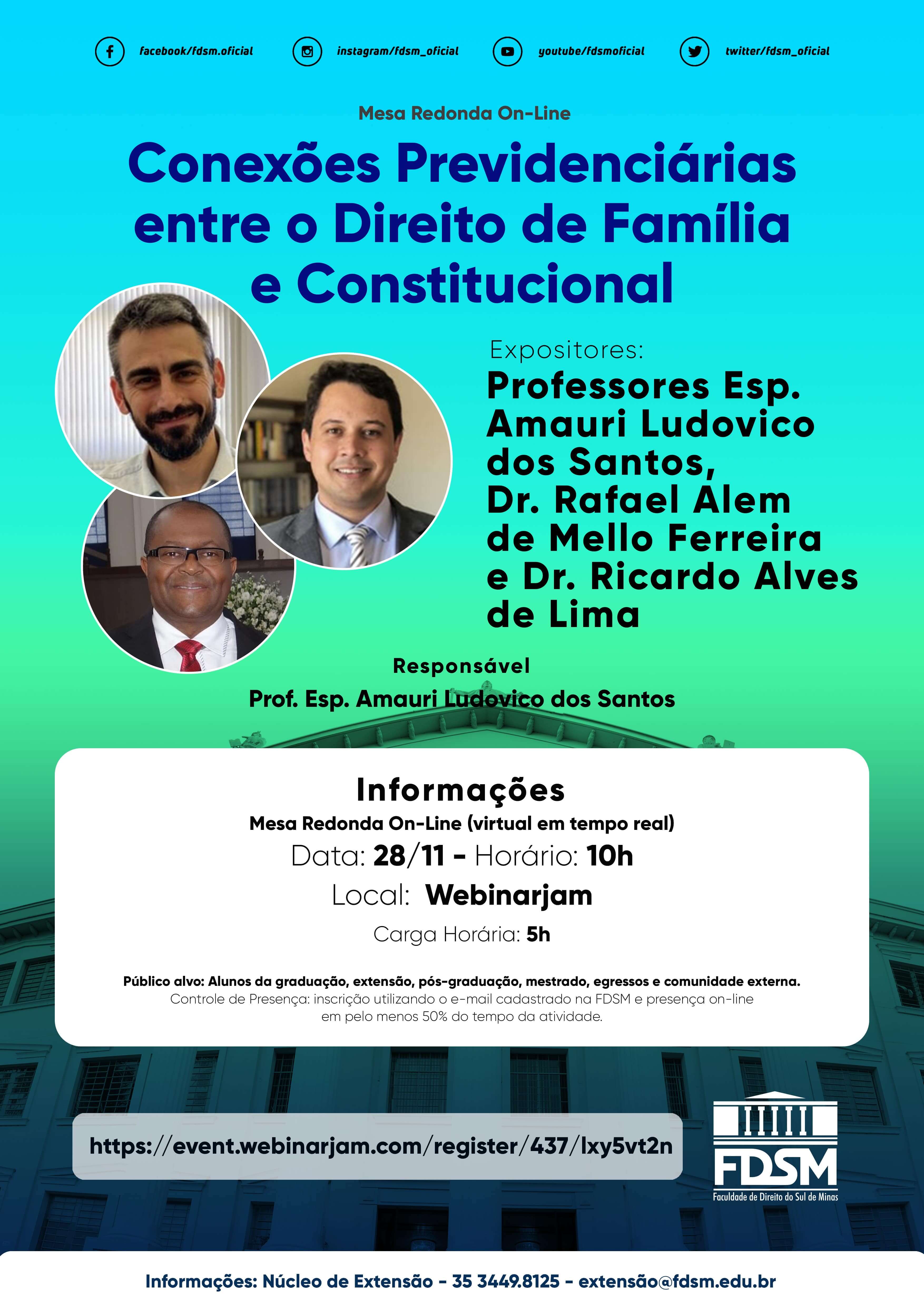 Inscrições abertas para a Mesa Redonda on-line com o tema "Conexões Previdenciárias entre o Direito de Família e Constitucional" sob a coordenação do Professor Especialista Amauri Ludovico dos Santos.