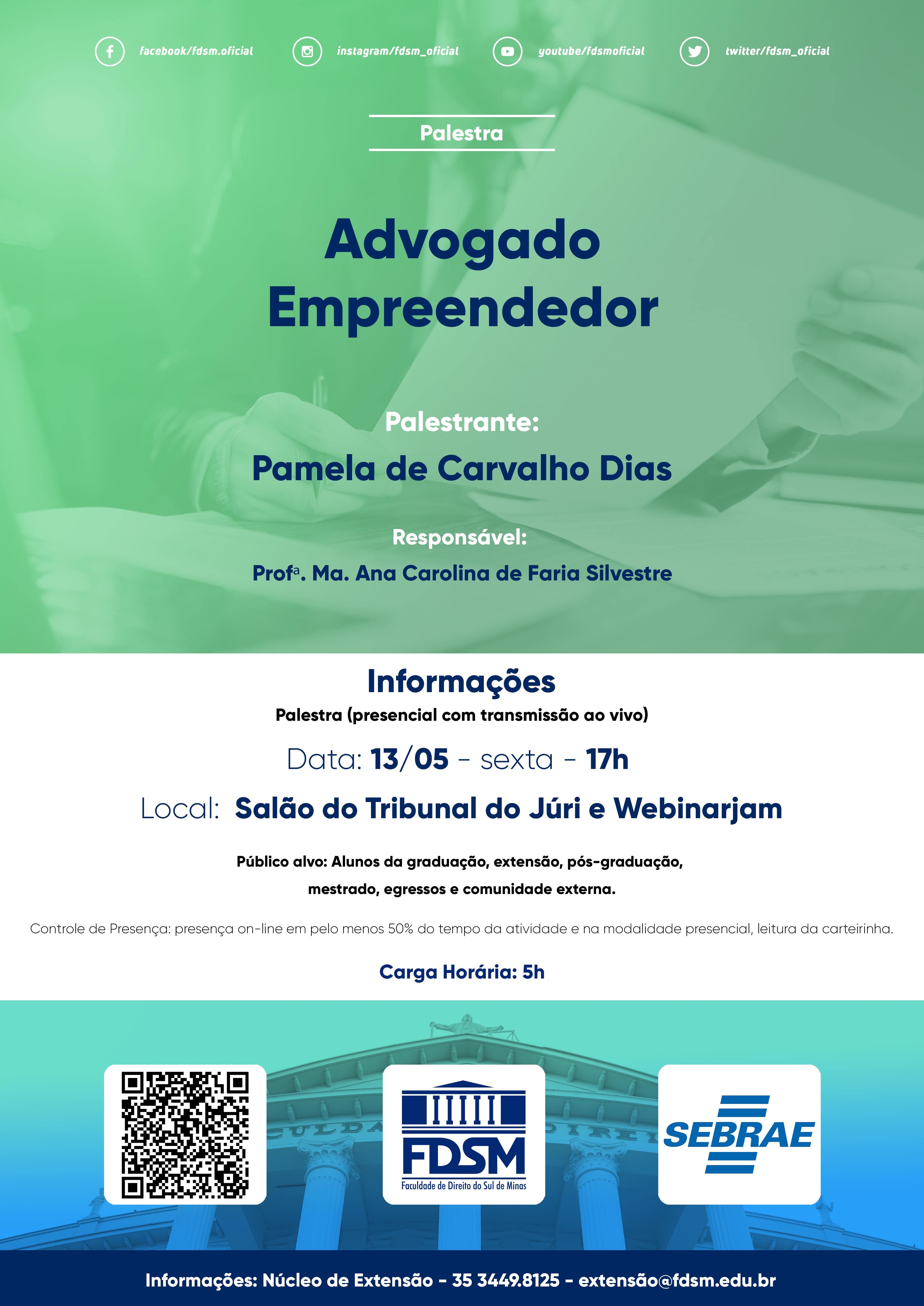 Inscrições abertas para a Palestra com o tema "Advogado Empreendedor" sob a coordenação da Professora Mestra Ana Carolina de Faria Silvestre.