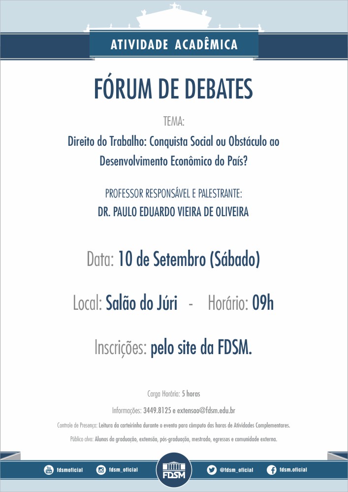 Inscrições abertas para o Fórum de Debates com o tema "Direito do Trabalho: Conquista Social ou Obstáculo ao Desenvolvimento Econômico do País?" sob a coordenação do Professor Dr. Paulo Eduardo Vieira de Oliveira.