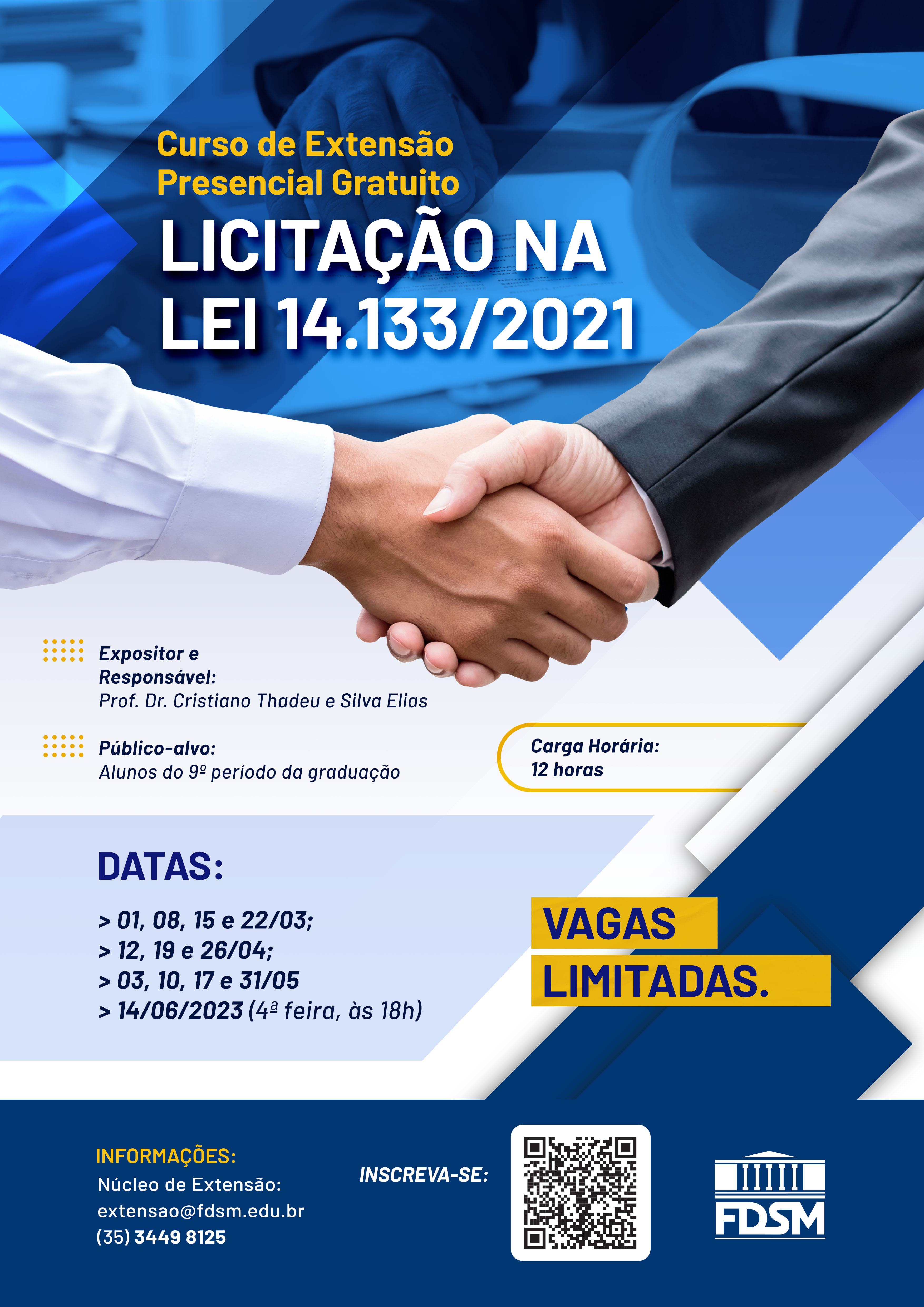 Inscrições abertas para o Curso de Extensão presencial e gratuito "Licitação na Lei 14.133/2021" sob a coordenação do Professor Cristiano Thadeu e Silva Elias.