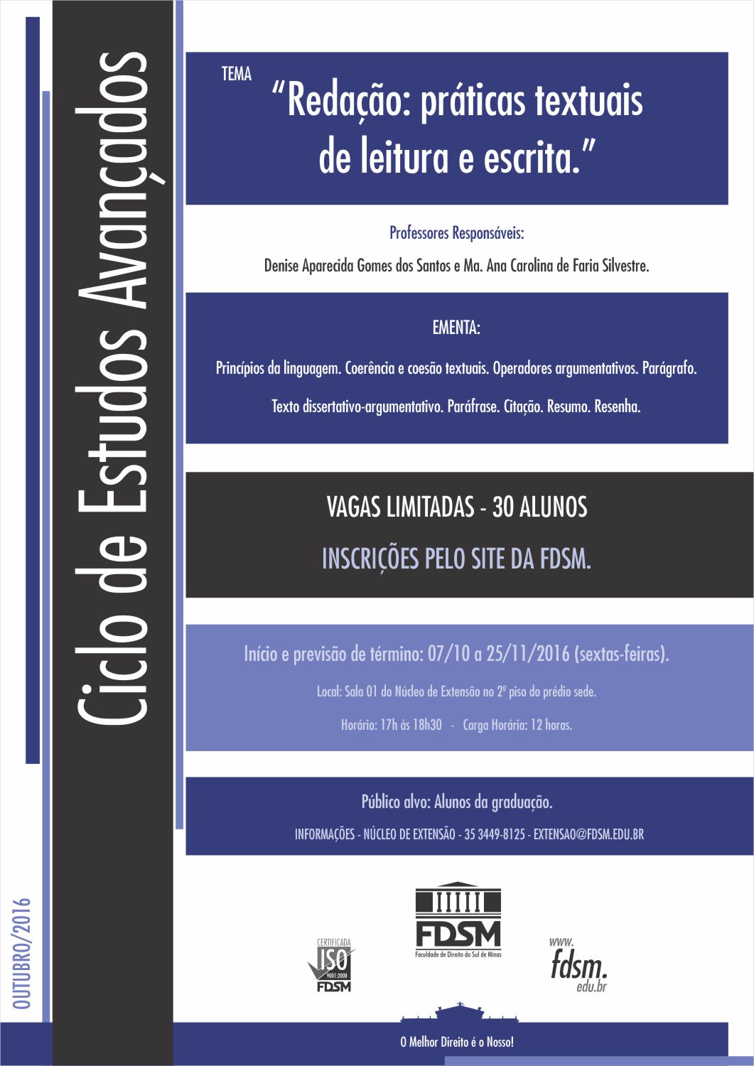 Inscrições abertas para o Ciclo de Estudos Avançados com o tema "Redação: práticas textuais de leitura e escrita" sob a coordenação das Professoras Ma. Denise Aparecida Gomes dos Santos e Ma. Ana Carolina de Faria Silvestre.