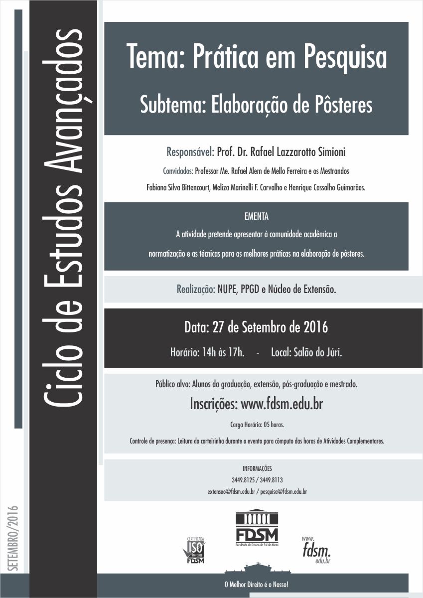 Inscrições abertas para o Ciclo de Estudos Avançados "Prática em Pesquisa - Elaboração de Pôsteres" sob a coordenação do Professor Dr. Rafael Lazzarotto Simioni.