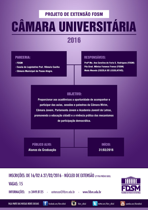 16/02/2016 às 16:41Parceria: Parceria da FDSM com a Escola do Legislativo Professor Rômulo Coelho e com a Câmara Municipal de Pouso Alegre.