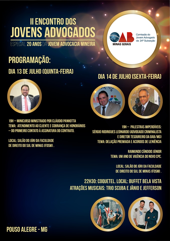29/06/2017 às 11:22A Comissão OAB Jovem da 24ª Subseção da OAB de Pouso Alegre/MG realizará nos dias 13 e 14 de julho o II Encontro dos Jovens Advogados. O evento deste ano celebrará os 20 de criação da OAB Jovem em Minas Gerais e contará com palestrantes de renome nacional, como o ex-presidente da OAB/MG, Raimundo Cândido Júnior, e o advogado criminalista Sérgio Leonardo, Diretor Tesoureiro da OAB/MG. As palestras serão ministradas no Tribunal do Júri da Faculdade de Direito do Sul Minas.