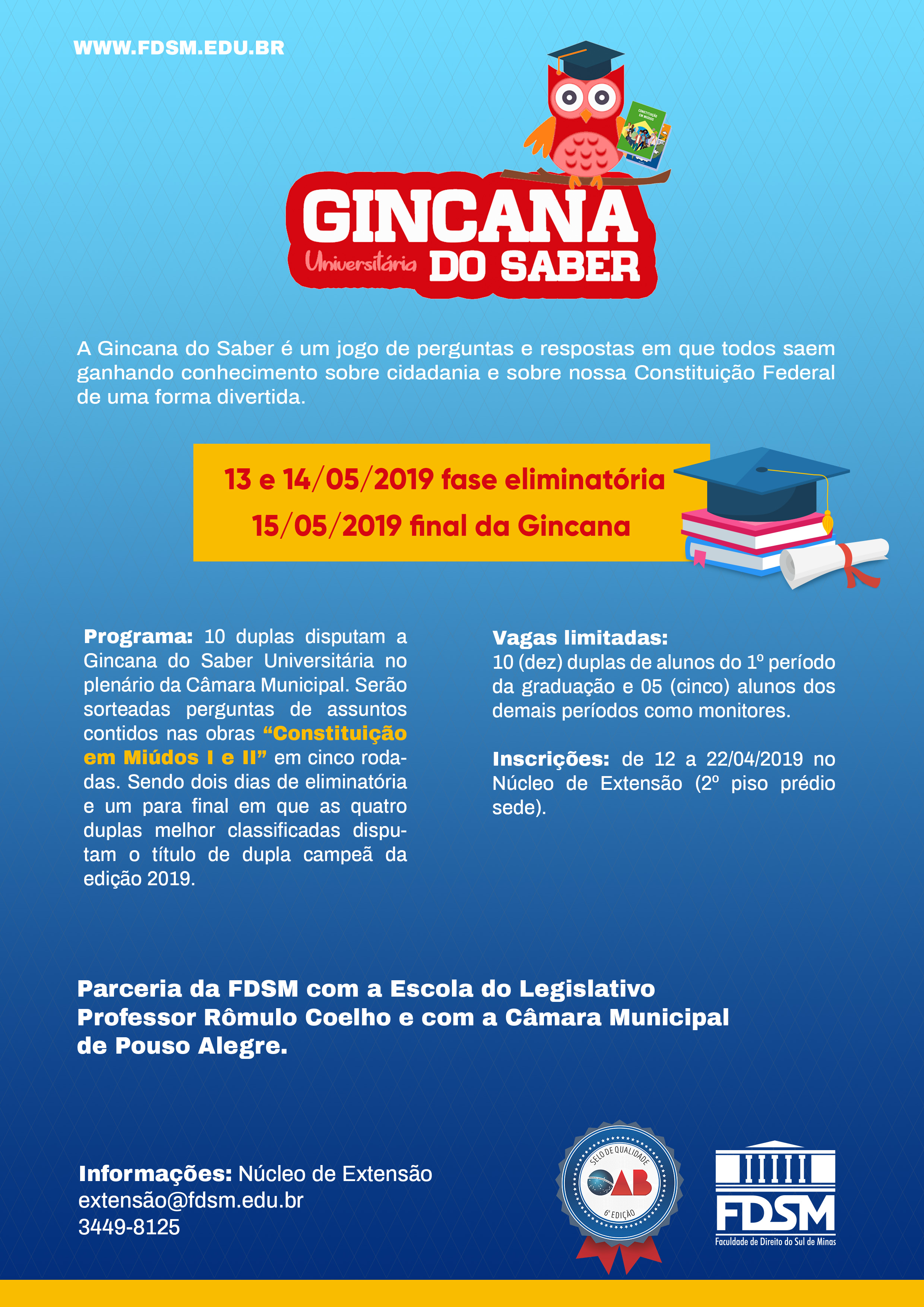 Programa: 10 duplas disputam a Gincana do Saber Universitária no plenário da Câmara Municipal. Serão sorteadas perguntas de assuntos contidos nas obras "Constituição em Miúdos I e II" em cinco rodadas. Sendo dois dias de eliminatória e um para final em que as quatro duplas melhor classificadas disputam o título de dupla campeã da edição 2019.