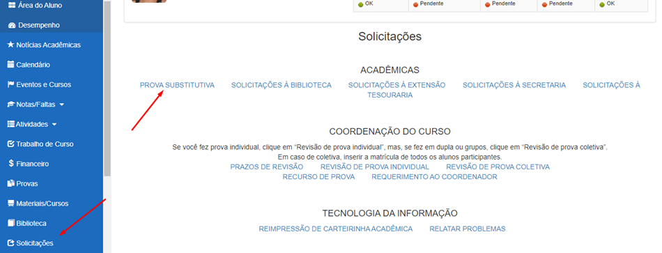 . O pedido da prova deverá ser feito com antecedência no portal do aluno – solicitações – acadêmicas - prova substitutiva: