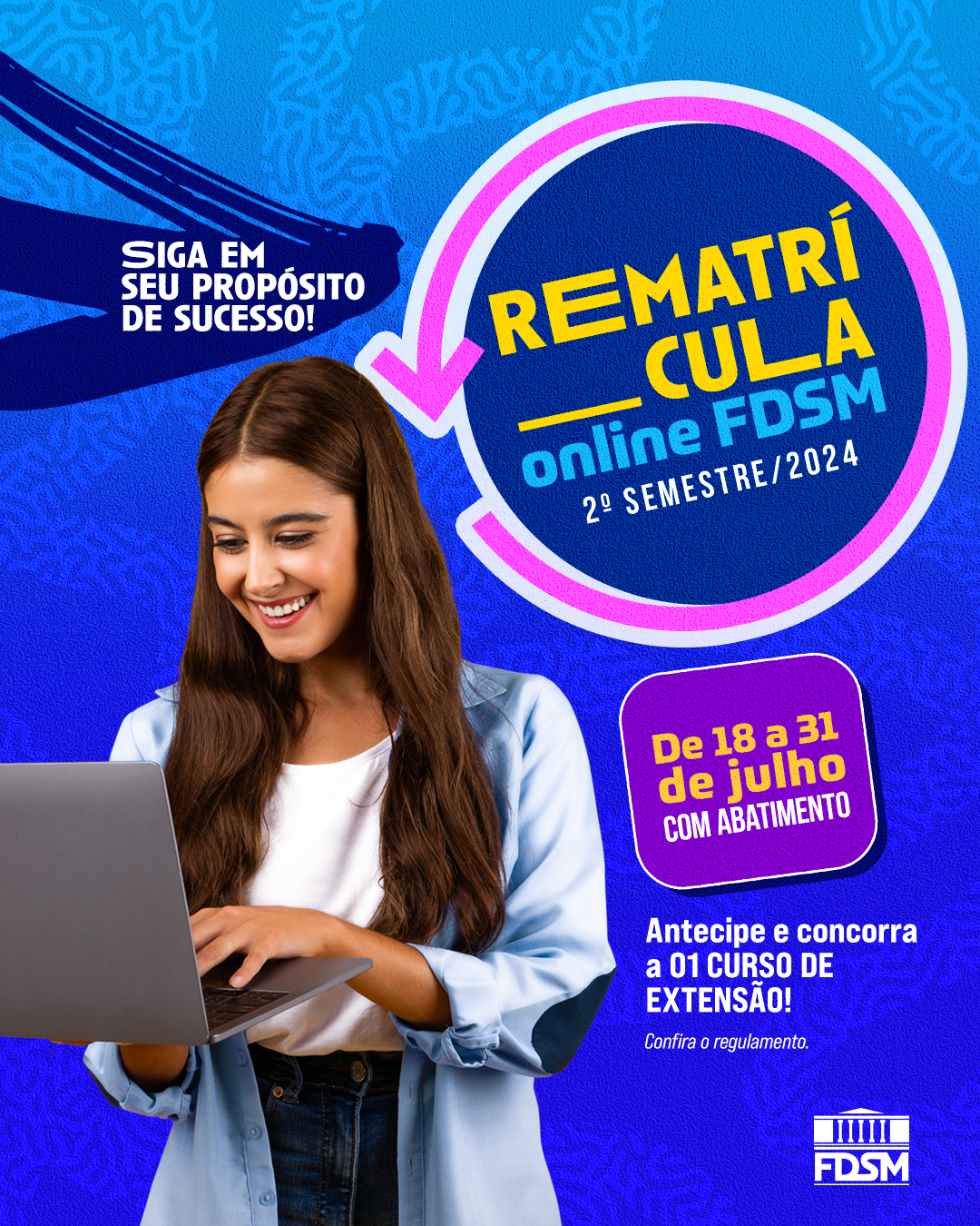 A FDSM irá sortear 10 CURSOS entre os alunos que realizarem e efetuarem o pagamento da Rematrícula no período de 18 a 31 de julho! Não perca essa oportunidade!