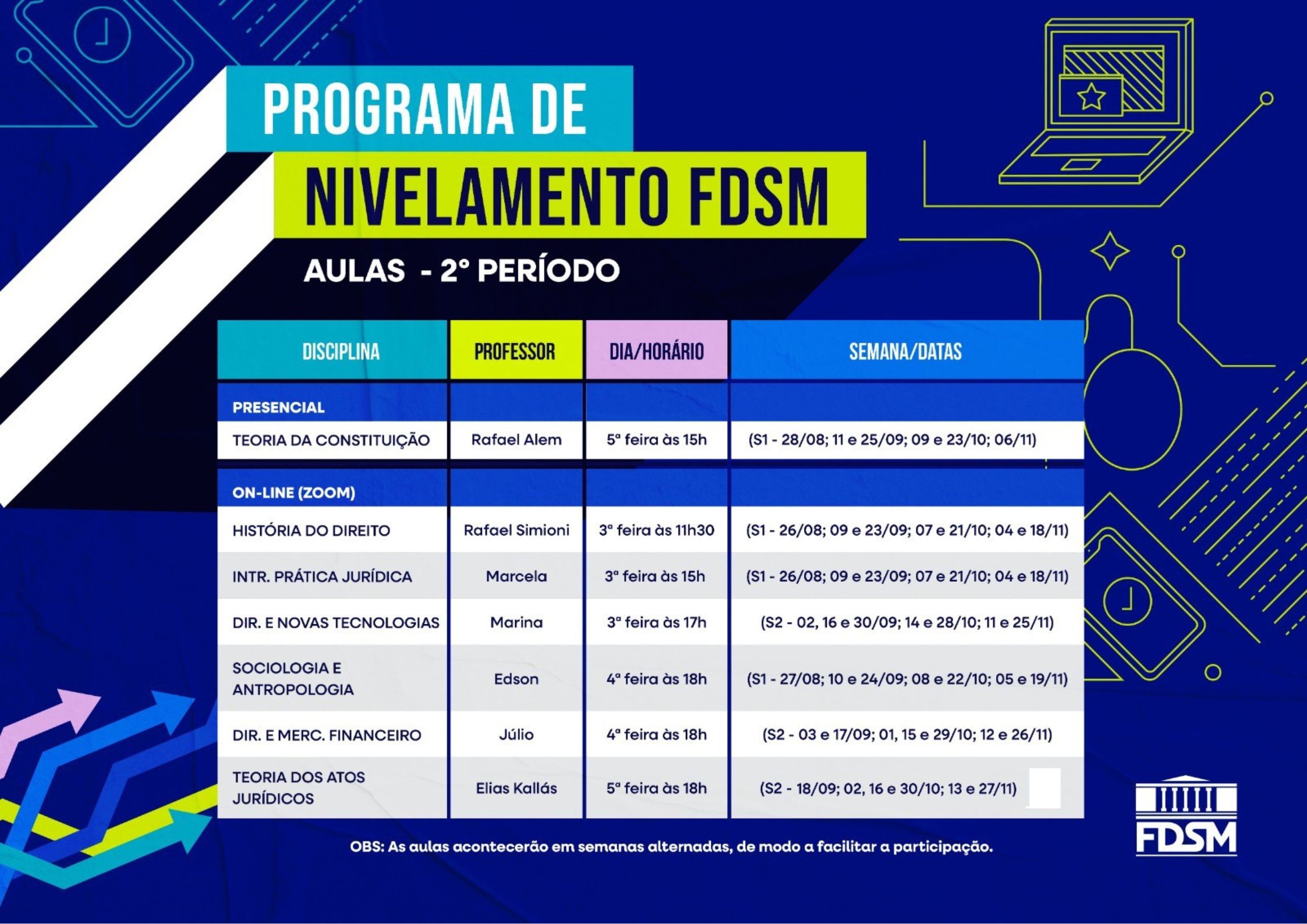 22/09/2025 às 07:39O Programa de Nivelamento da FDSM foi desenvolvido para oferecer um reforço essencial nos conteúdos e habilidades fundamentais para a formação jurídica.