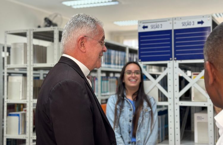 Dom Majella na Biblioteca, interagindo com alunos e colaboradores.