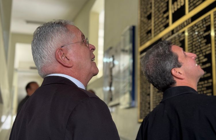 Dom Majella conhecendo algumas placas de formatura do acervo da FDSM.