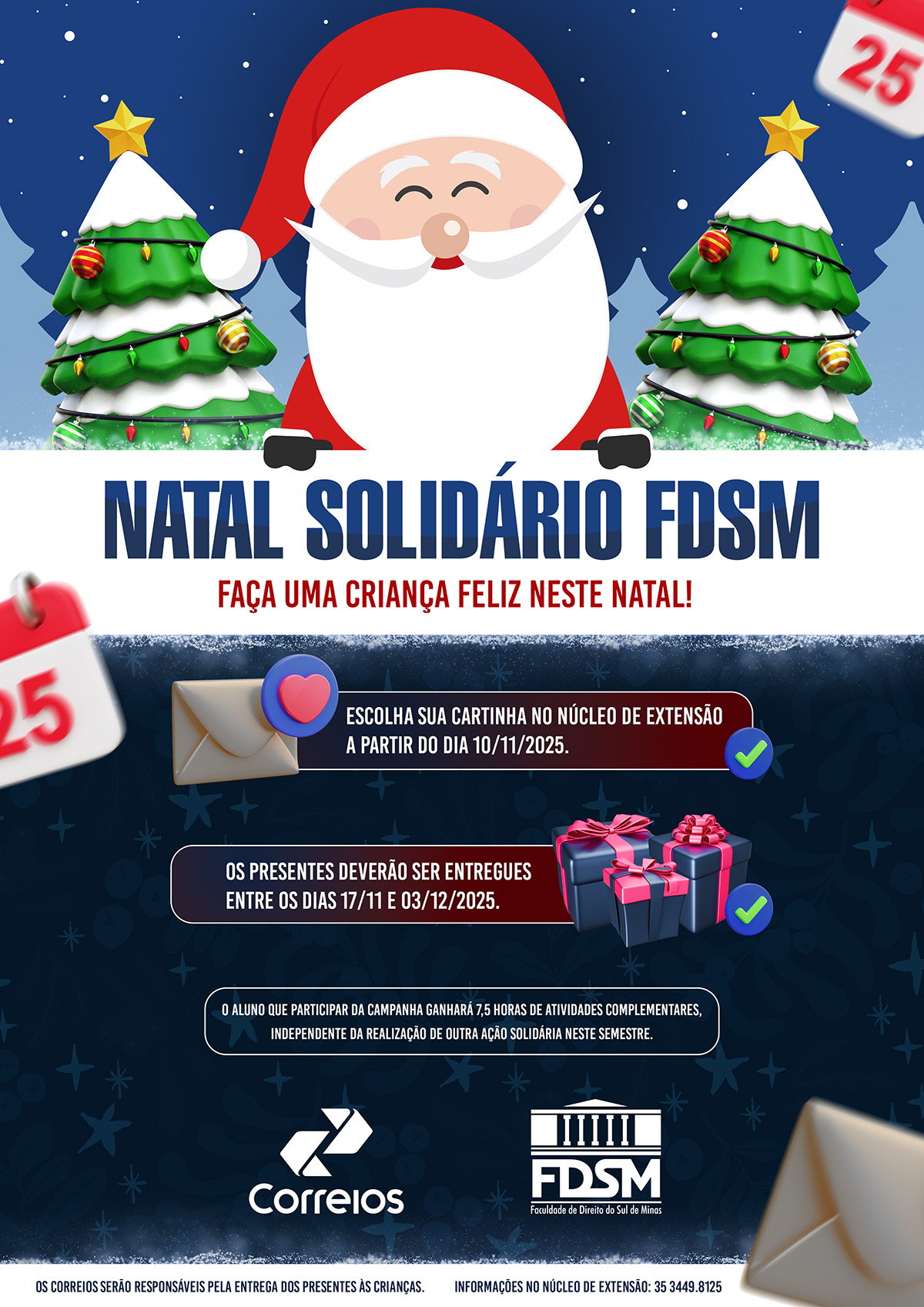 17/11/2025 às 09:00A Faculdade de Direito do Sul de Minas (FDSM), por meio do Núcleo de Extensão, convida toda a comunidade acadêmica a participar da tradicional campanha Papai Noel dos Correios 2025, uma iniciativa que transforma sonhos em realidade e proporciona um Natal mais feliz para centenas de crianças em situação de vulnerabilidade social.