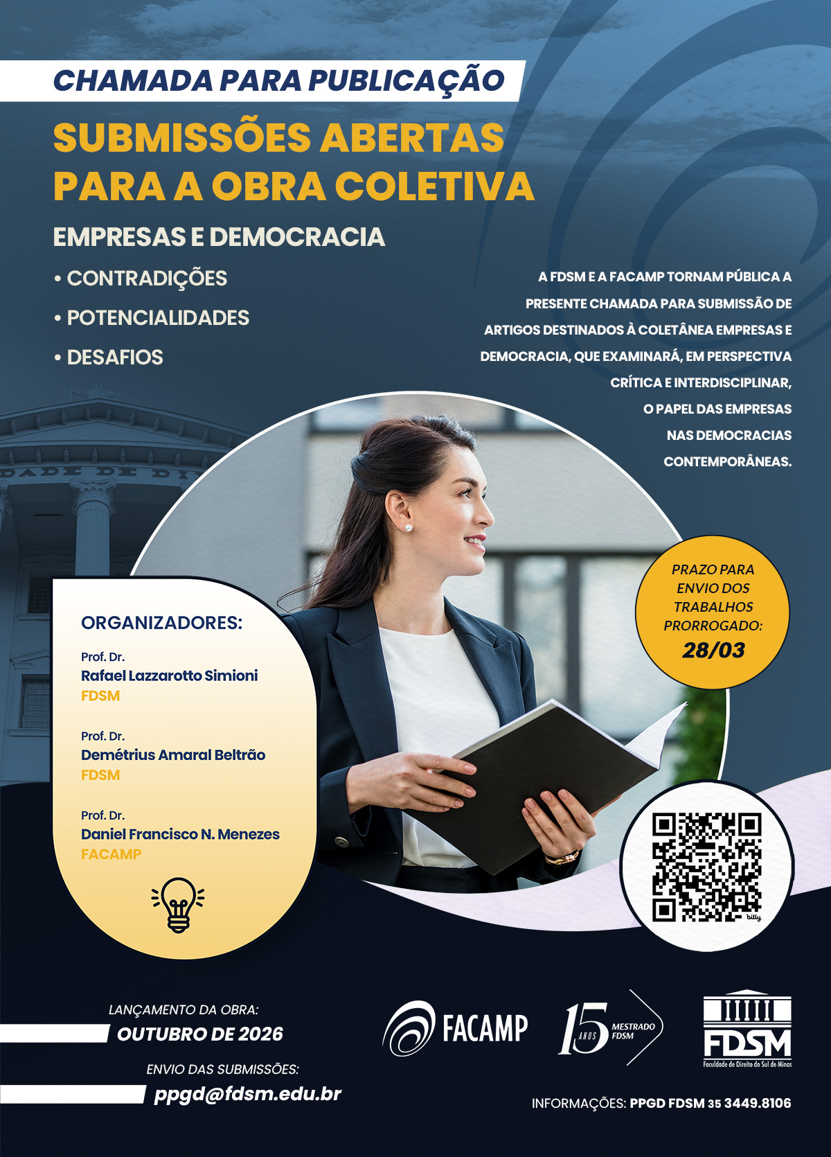 26/02/2026 às 08:56Os Programas de Pós-Graduação em Direito da FDSM e da FACAMP lançam a chamada pública para submissão de capítulos da obra coletiva Empresas e Democracia: Contradições, Potencialidades e Desafios Contemporâneos, organizada pelos professores Rafael Lazzarotto Simioni, Demétrius Amaral Beltrão e Daniel Francisco Nagao Menezes.