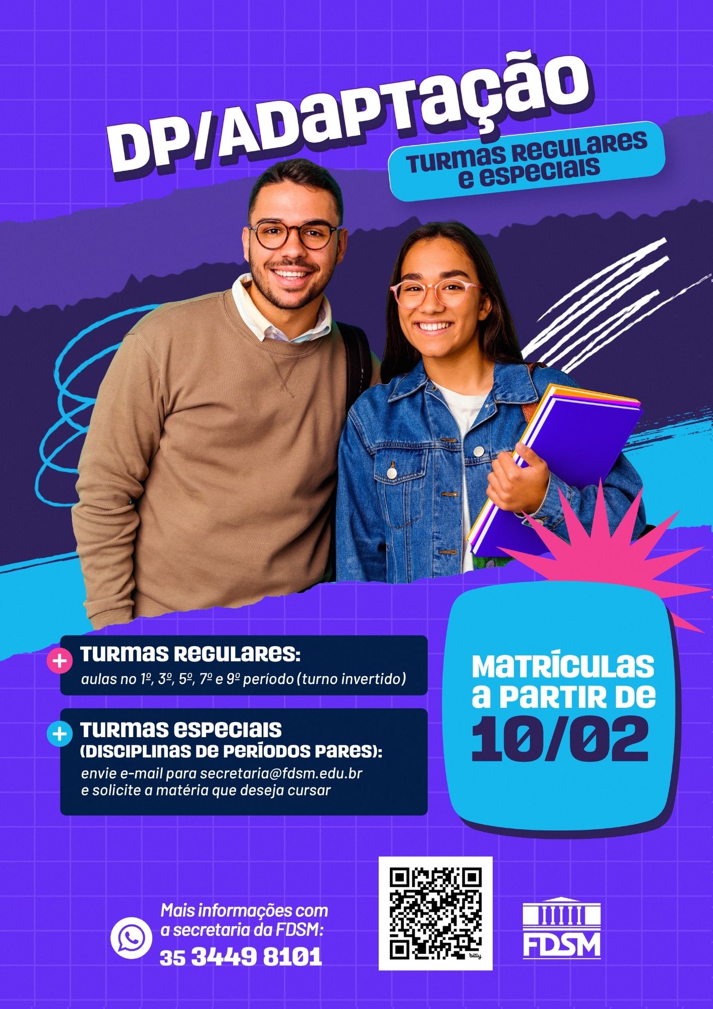 Mais informações na Secretaria: WhatsApp 35 3449-8101 / secretaria@fdsm.edu.br