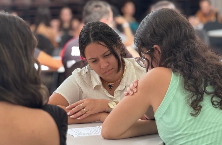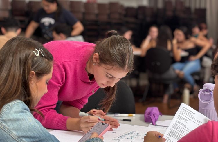 Na sequência, os participantes foram divididos em grupos e convidados a registrar, em cartolinas, suas percepções e aprendizados sobre o tema. A dinâmica estimulou o trabalho em equipe, o pensamento crítico e a capacidade de síntese. Ao final, os materiais produzidos foram expostos em um “varal”, transformando o espaço em uma verdadeira mostra de ideias. Um aluno representante de cada grupo apresentou aos demais o entendimento construído coletivamente, enriquecendo o debate e ampliando as perspectivas sobre o assunto.